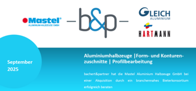 Im Zuge einer Investorensuche im Rahmen des Insolvenzverfahrens konnte für die Mastel Aluminium Halbzeuge GmbH aus Talheim bei Heilbronn ein branchennahes Bieterkonsortium, bestehend zu gleichen Teilen aus der GLEICH Aluminium Gruppe und Heinrich Spahn, gewonnen werden. Die GLEICH 1 Verwaltungs GmbH übernimmt das Unternehmen und führt den Geschäftsbetrieb künftig unter der neuen Firmierung Mastel Metall GmbH fort. Die Transaktion wurde von bachert&partner auf Verkäuferseite exklusiv begleitet.